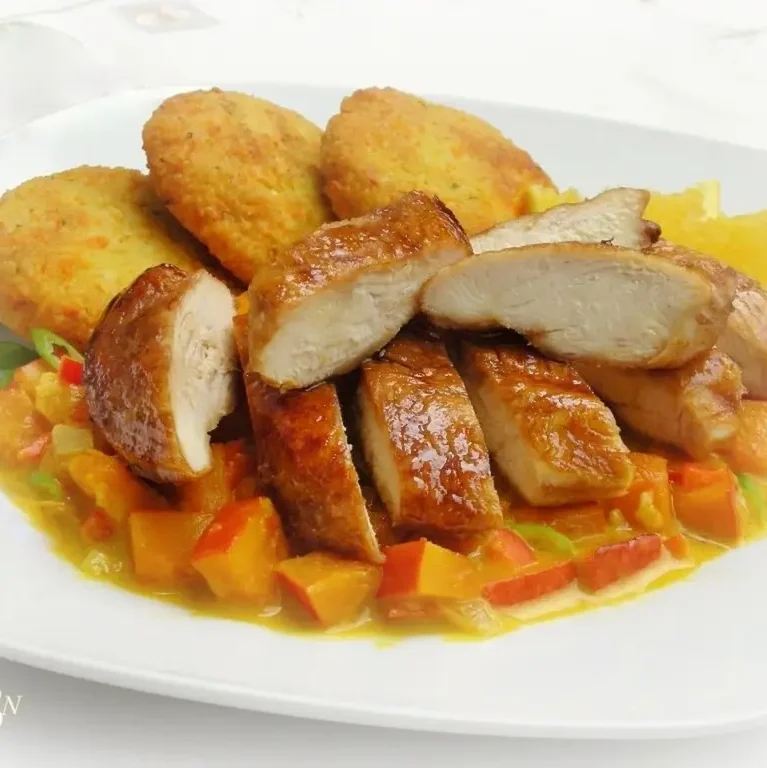 Huhn, Reis, scharfes Naturschnitzel, scharfer Tomatensauce